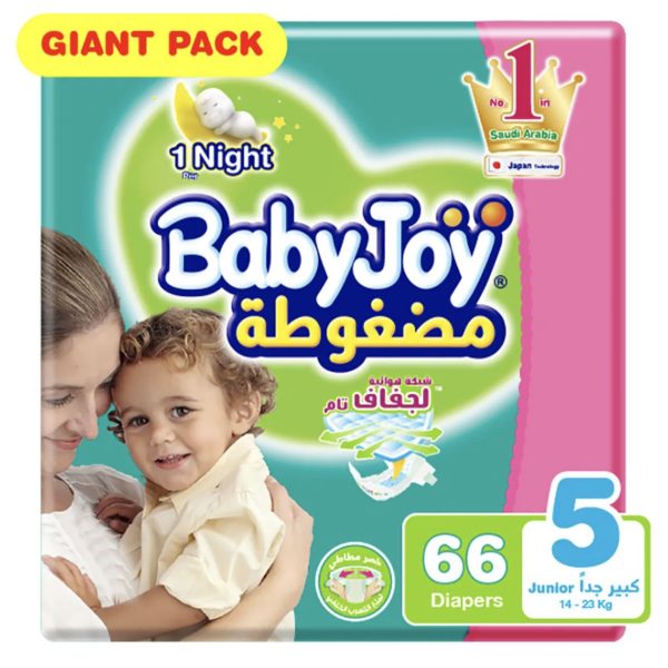 السعر الأصلي هو: 3.20 .د.ب.1.90 .د.بالسعر الحالي هو: 1.90 .د.ب.بيبي جوي – حفاظات بحشوة مضغوطة 66 حبة – الحجم 5 – وزن 12 الي 23 كيلو