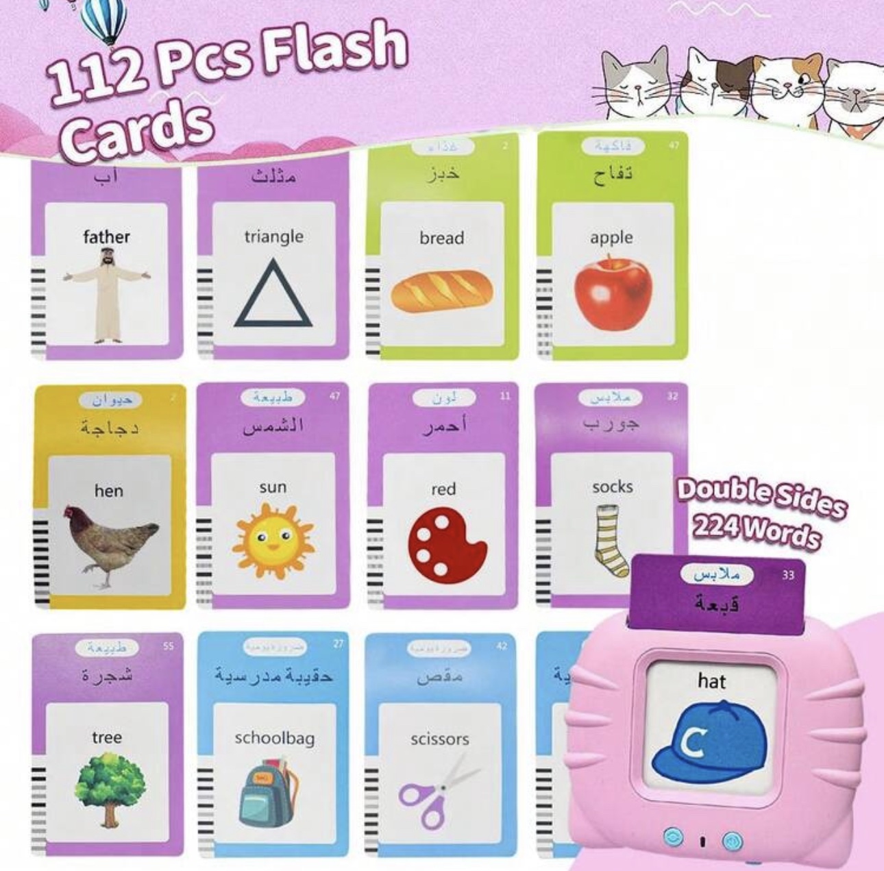 لعبة البطاقات التعليمية - بلغة العربي و الانجليزي 224 كلمة - لون الوردي