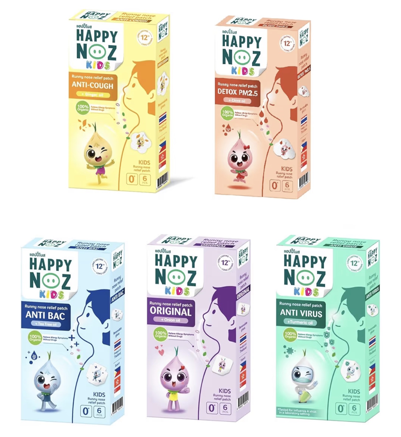 أصلي – يخفف من نزلات البرد وانسداد الأنف وسيلان الأنف. مضاد للفيروسات – يوازن الجهاز المناعي والحماية من الفيروسات. مضاد للبكتيريا – يقلل من نمو البكتيريا. مضاد للسعال – يزيل المخاط من الجهاز التنفسي، ويقلل من السعال. ديتوكس بي ام 2.5 – يحتوي على مضادات الأكسدة التي تساعد على تقليل تهيج الحلق والأنف من مساء 2.5. مكونات عضوية 100% ومعتمدة من وزارة الزراعة الأمريكية توازن الجهاز المناعي وحماية الأطفال من الفيروسات. سهلة الاستخدام تلتصق على الرقعة/الستيكر اللاصق 6 عبوات فردية في كل صندوق. تحتوي هذه الحزمة على صندوق واحد لكل صندوق أصلي (أرجواني)، مضاد للبكتيريا (أزرق)، مضاد للسعال (أصفر)، مضاد للفيروسات (أخضر)، وإزالة السموم PM2.5 – إصدار الأطفال. صُنع في تايلاند.
